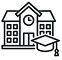 A black and white line drawing of a school building with a clock above the entrance and a graduation cap positioned in the foreground.
