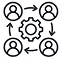 A black and white line drawing shows four user icons connected by arrows in a circle around a gear, symbolizing teamwork, collaboration, or workflow.