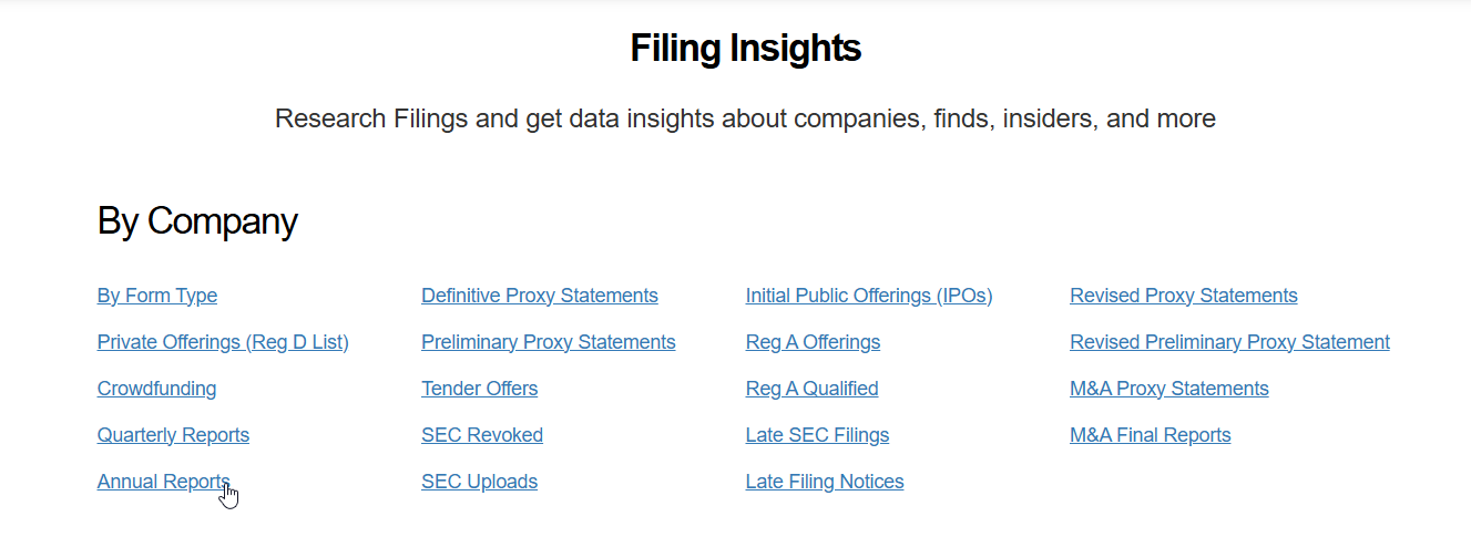 A webpage titled "Filing Insights" is displayed. It offers research on company filings and insights. Categories listed include By Form Type, Private Offerings, Crowdfunding, and more, with links like Annual Reports and SEC Uploads visible below.