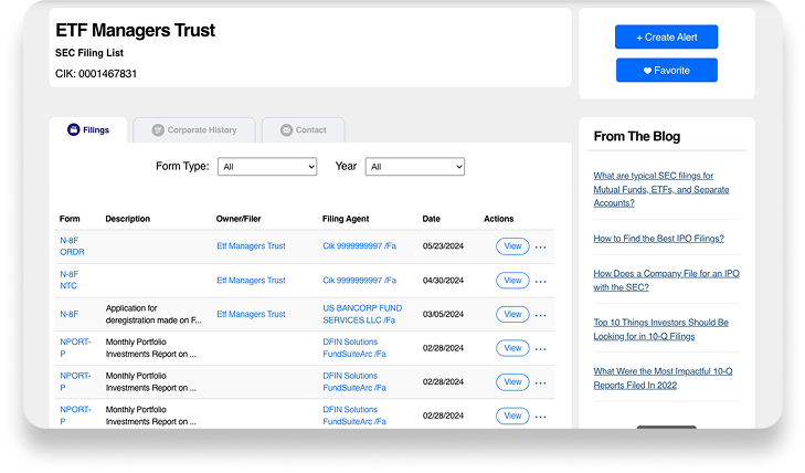 A webpage displays the ETF Managers Trust SEC filing list. The table shows filing name, ownership, filing agent, date, and actions. Options to filter form type and year are at the top. A sidebar contains blog links.