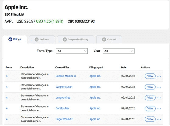A screenshot of Apple Inc.’s SEC filing list, found via SEC Edgar Search, shows the stock price at USD 236.87, up 4.25. The filings include several “Statement of changes in beneficial ownership” forms dated 02/04/2025.