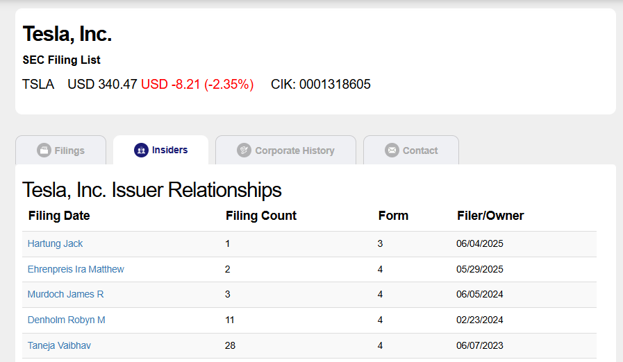 A screenshot of Tesla, Inc.’s SEC filing list shows a TSLA stock price of $340.47, down $8.21 (2.35%). Below is a table of issuer relationships listing five filers/owners, their filing counts, forms, and filing dates.