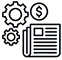 Black and white icon showing a newspaper, two gears, and a coin with a dollar sign, symbolizing news or information about business, finance, industry, or SEC filing alerts.