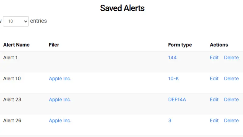 A table labeled "Saved Alerts" displays four rows with SEC filing alerts, filer names, form types, and actions. Each row lists "Edit" and "Delete" options on the far right for managing your SEC filing notifications.