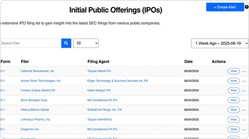 A webpage displays a table of initial public offerings (IPOs) listing the form, filer, filing agent, date, and action buttons. A blue "Create Alert" button for free EDGAR alerts is at the top right, with a search bar above the table.