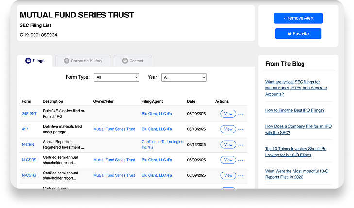 Screenshot of a web page showing a list of SEC filings for the Mutual Fund Series Trust, including form types, descriptions, owners, filing agents, filing dates, actions, and sidebar links to blog articles.