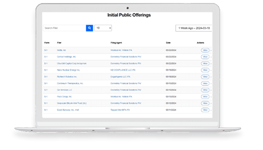 A laptop displaying a webpage with a table titled "Initial Public Offerings," listing companies, filing agents, and dates, along with a search bar and filter options at the top.