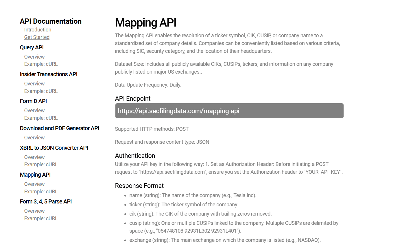 A webpage displays API documentation for the "Mapping API." The page lists API endpoint details, supported methods, authentication instructions, data formats, and a navigation menu on the left.