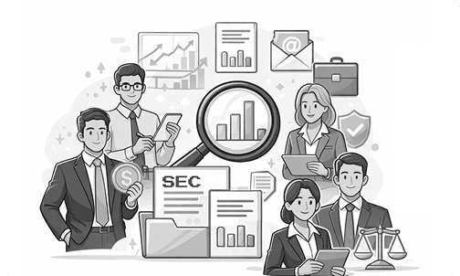 Illustration of five business professionals surrounded by charts, graphs, documents labeled "SEC," a magnifying glass, a dollar coin, a scale, email, and a briefcase, depicting financial analysis and regulation.