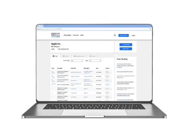 A laptop displaying the SEC EDGAR online database with Apple Inc. search results, showing a list of filings and related details such as form types, dates, and document links.